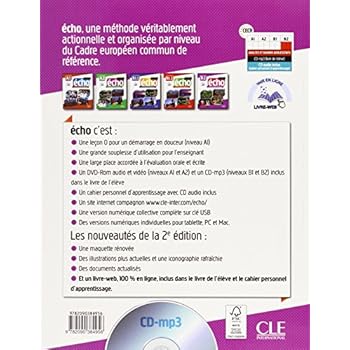 Écho, une méthode véritablement actionnelle et organisée par niveau du Cadre européen commun de référénce écho c'est: une leçon 0 pour un démarrage en douceur (niveau A1) une grande souplesse d'utilisation pour l'enseignant une large place accordée à l'évaluation orale et écrite un DVD-Rom audio et vidéo (niveaux A1 et A2) ou un CD-mp3 (niveaux B1 et B2) inclus dans le livre de l'élève un cahier personnel d'apprentissage avec CD audio inclus un site compagnon www.cle-inter.com/echo/ Les nouveautés de la 2e édition: une maquette rénovéedes illustrations et une iconographie actuelles des documents mis à jouret un livre-web, 100% en ligne, inclus dans le livre de l'élève et le cahier personnel d'apprentissage.