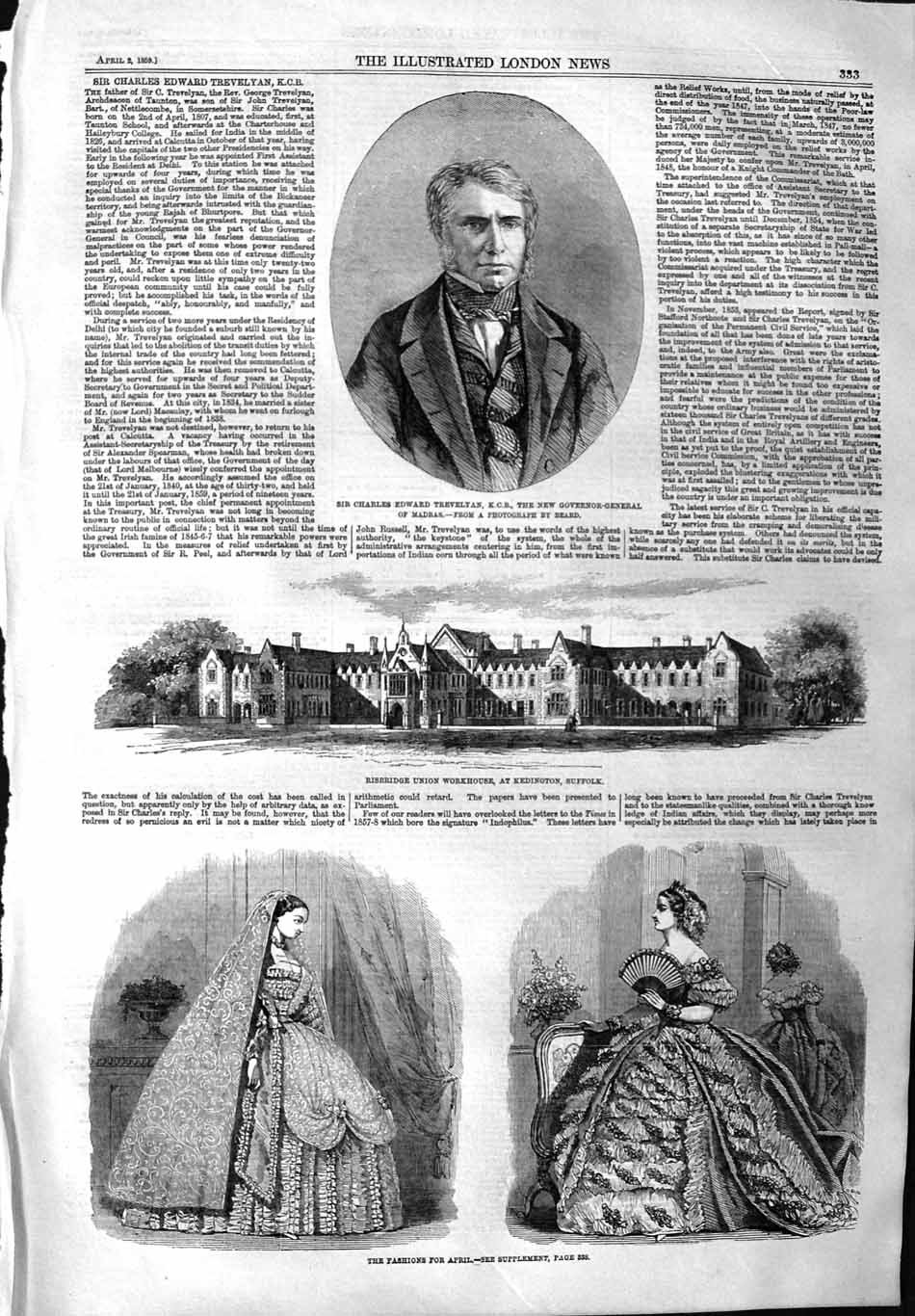 MODE 1859 DE S DE FEMMES DE CHARLES EDOUARD TREVELYAN MADRAS ' Full page from the Illustrated London News dated 1859, an illustrated weekly newspaper weeks date as shown on top of page, the size of each page is approx ( including margins as shown )imately 11 x 16 inches (280x410). All are genuine antique prints and not modern copies, the Illustrated London News is an illustrated magazine which was first printed in 1842 and is the finest pictorial example of a historic social record of British and world events up to the present day. The ILN is known for its coverage of the following subjects the wars, ships, boats, guns, sailing, portraits, fine art, old and antique prints, wood cut, wood engravings, early photographs, Victorian life, Victorian culture, kings, queens, royalty, travels, adventures, natural history, birds, fish, mammals, fishing, hunting, shooting, fox hunting, sports including tennis, cricket, football, horse racing, politics and many more items of interest founded by Herbert Ingram may 14th 1842.